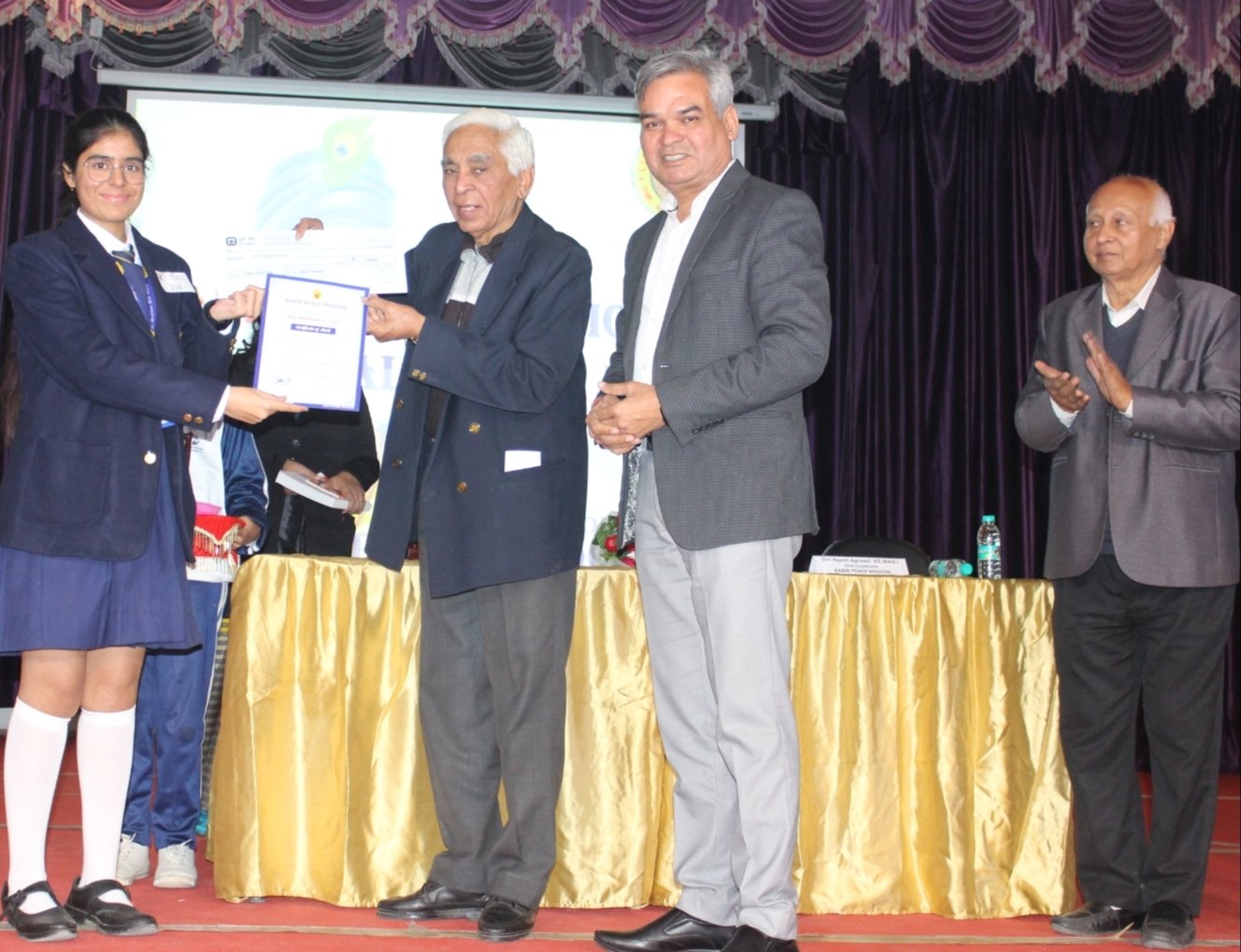 कबीर शांति मिशन के चीफ कोऑर्डिनेटर राजेश अग्रवाल ने सभी गण्यमान्य अतिथियों के साथ मिलकर सभी विजयी छात्रों को नगद पुरुस्कार एवं प्रमाणपत्र वितरित किये।